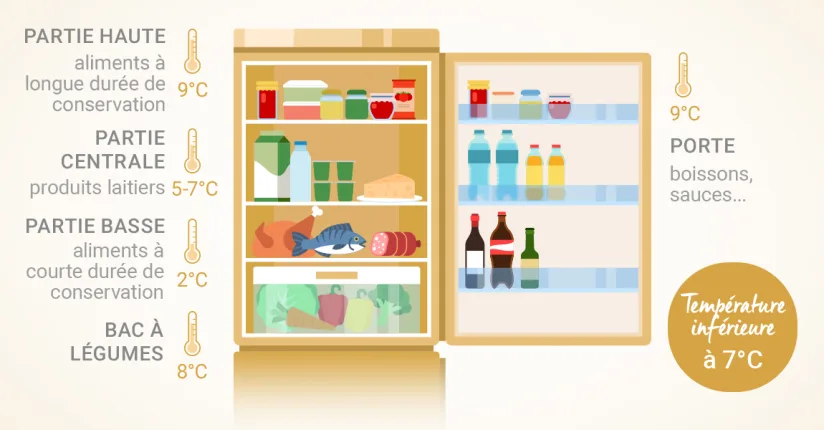 - Respectez les zones de température : viandes et poissons en bas (zone la plus froide, 0-2 °C), produits laitiers au milieu, fruits et légumes dans le bac dédié, boissons et condiments dans la porte (zone la plus chaude, 6-10 °C).