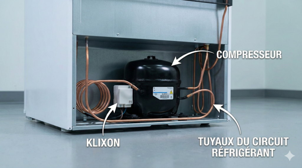 Le klixon est un relais de protection qui coupe le compresseur en cas de surchauffe. Au Maroc, les coupures ONEE et la chaleur accélèrent son usure. Si votre compresseur « clique » sans démarrer, c’est souvent le klixon ou le relais qui est en cause.