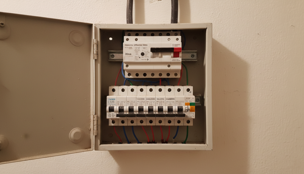 - Le disjoncteur différentiel 30 mA est présent et fonctionne (testez-le avec le bouton « Test »).